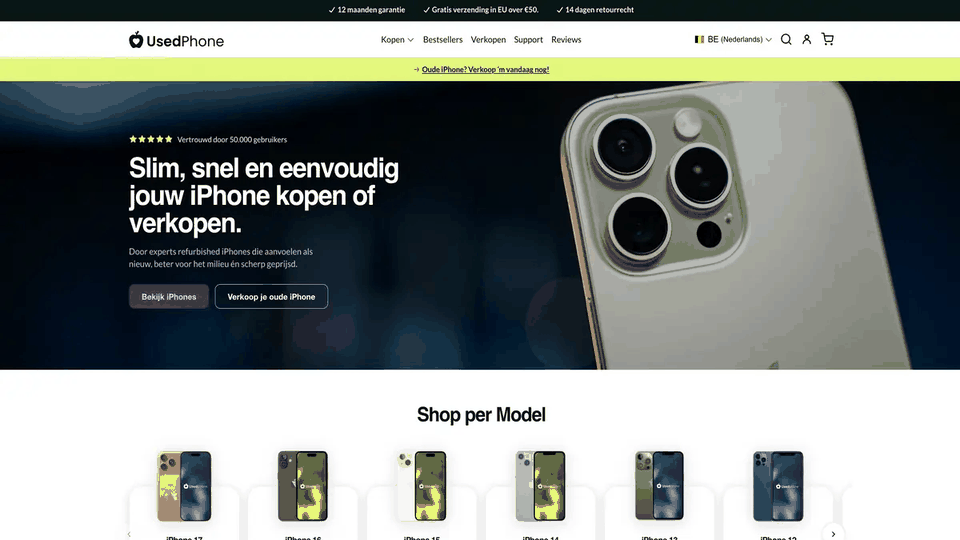 "De grootste concurrent van UsedPhone is niet een andere webshop," zegt Niels. "Het is de twijfel van de klant. Elke ontwerpkeuze op deze site is gemaakt om die twijfel weg te nemen."
